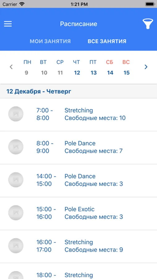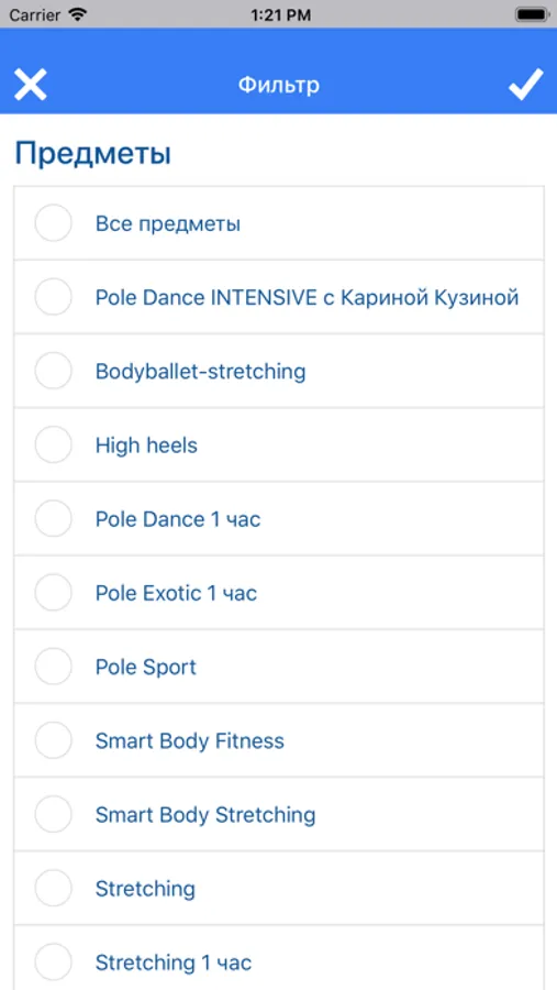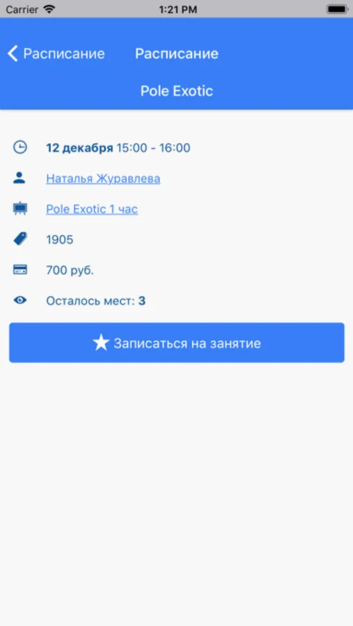 Приложение позволяет видеть полное или только свое расписание уроков, открытые абонементы с оставшимися занятиями, операции по оплате занятий.