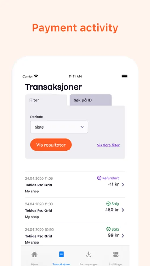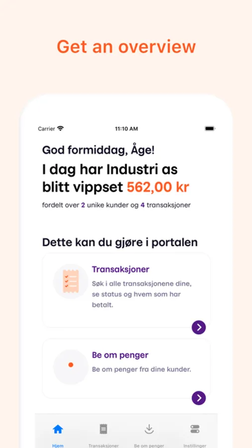 When you receive payments with Vipps, this app gives you a good overview of all transactions. You also have the opportunity to send a payment request using the customer's telephone number. You find more features in VippsPortalen on vipps.no.