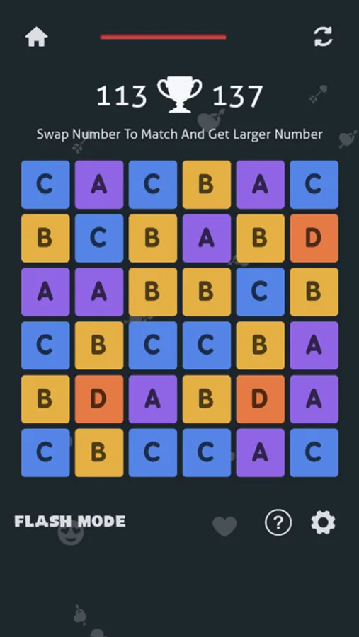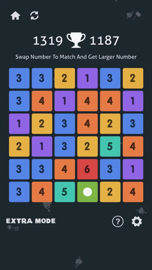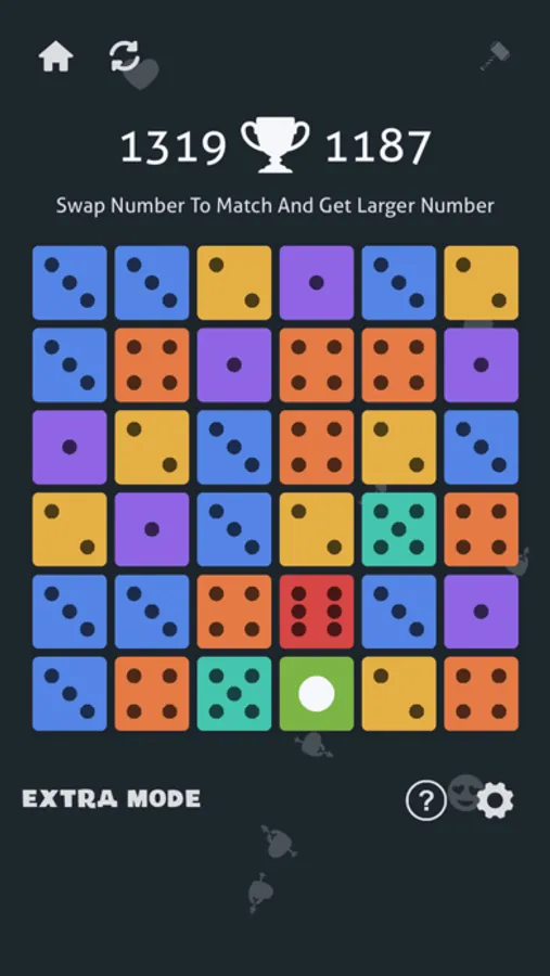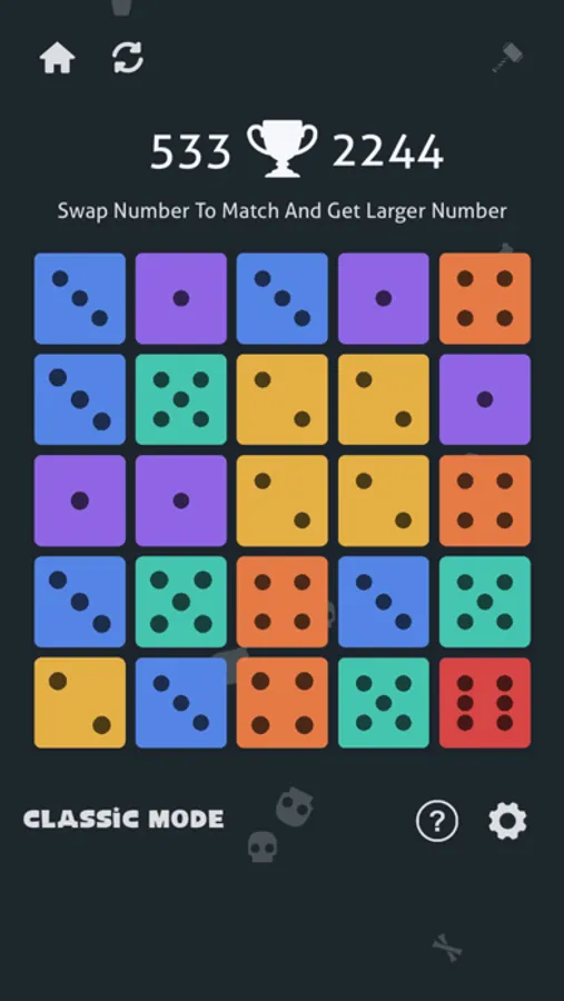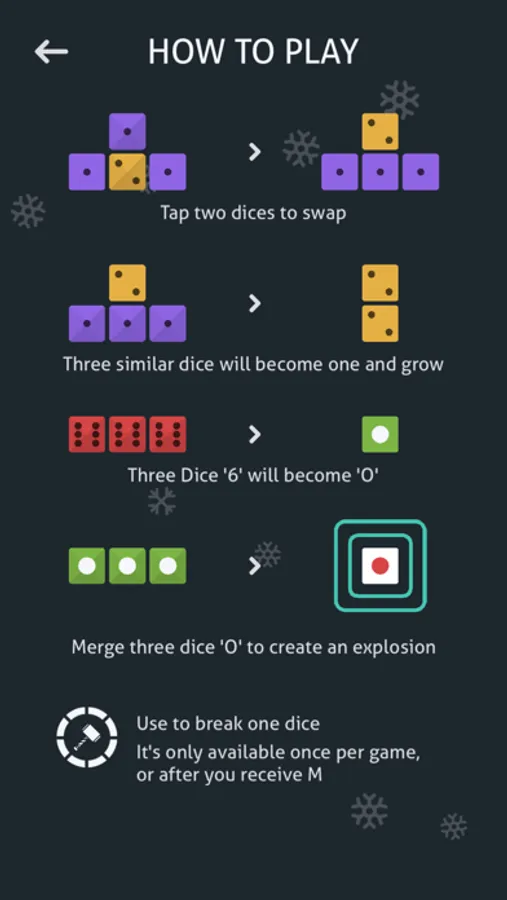 Tap the tiles to swap 2 dice to get 3 or more same dice in a row or a column and get bigger dice. Eg: 1 → 2, 2 → 3, ... , 6 → 'O, 'O' will create an explosion.