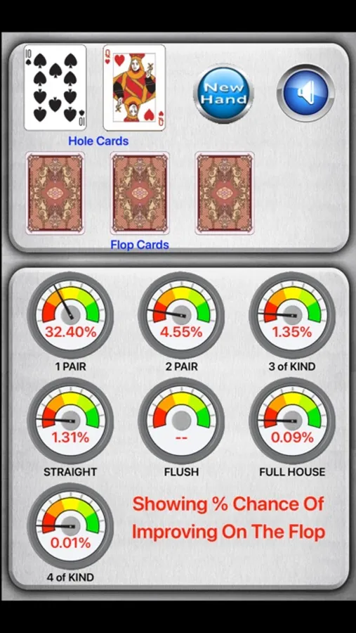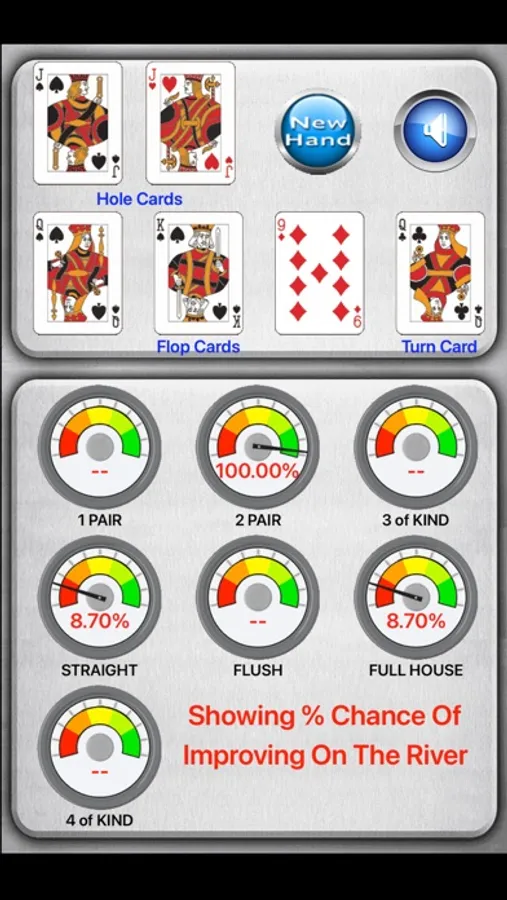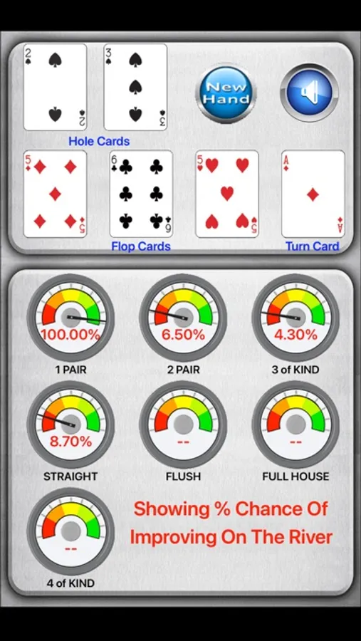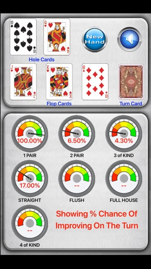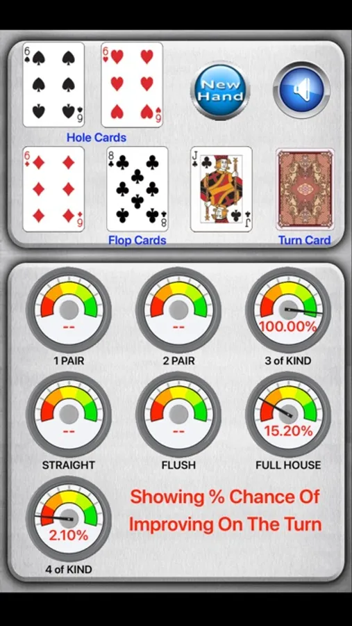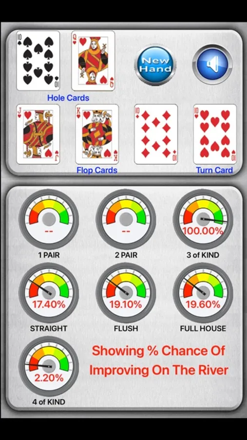 But the real magic of Next Street Poker Odds lies in its Hand Improvement Dials. These visually stunning meters display your odds of improving your hand on the next street, clearly and accurately: