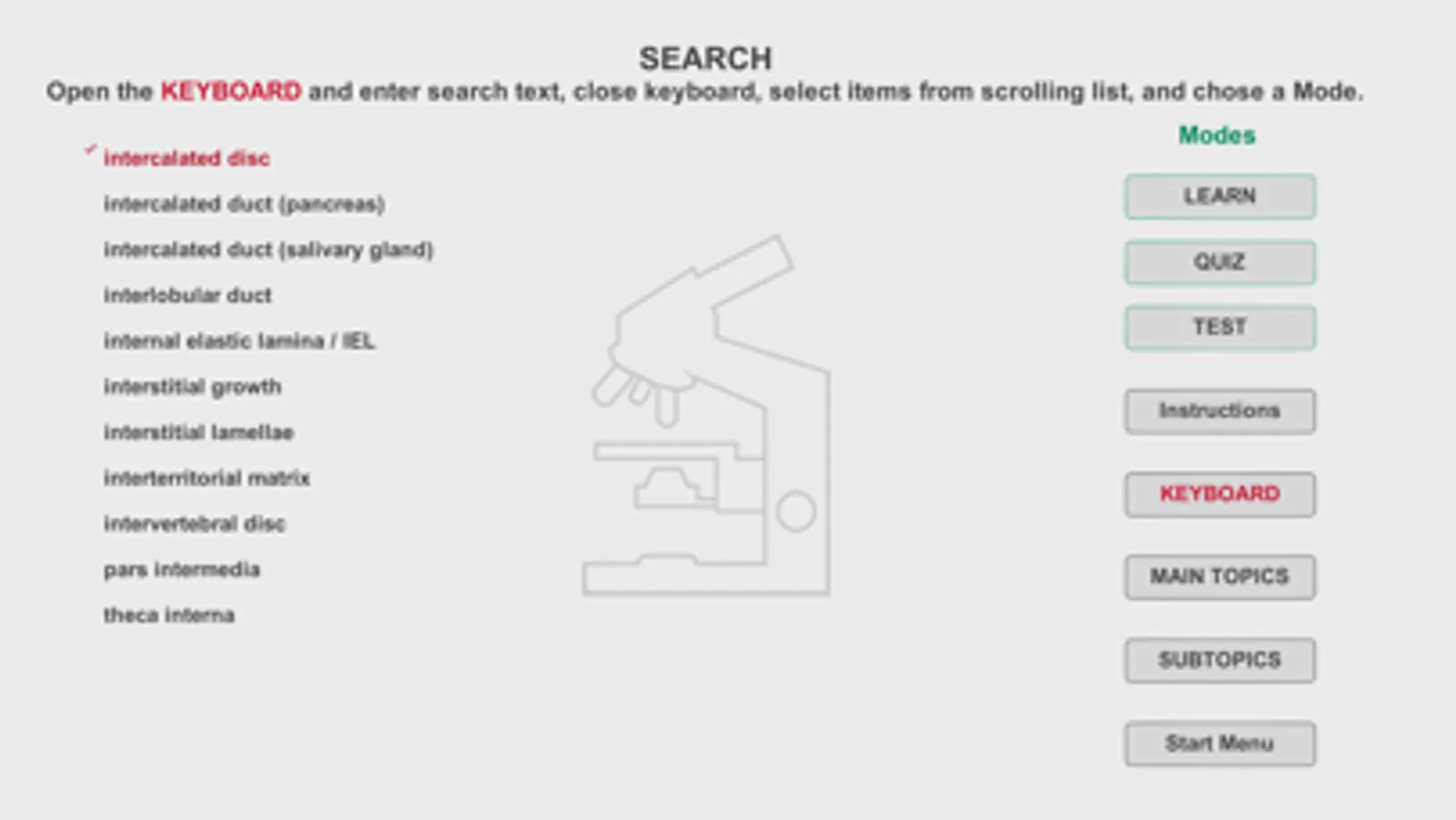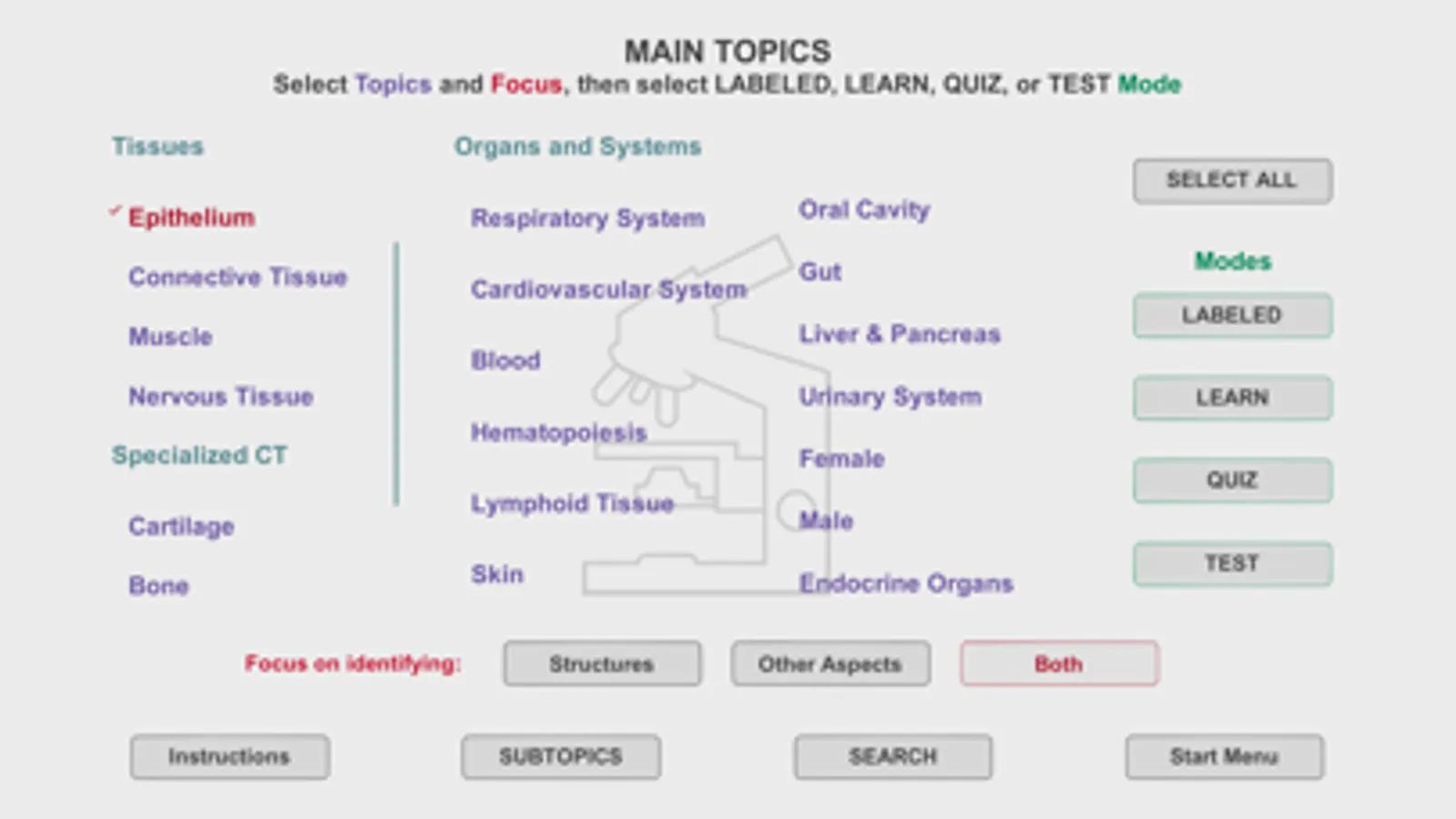 •This mode presents 92 micrographs that cover the Main Topics. Important structural features are named, and short explanations are given. These micrographs provide an efficient way for anyone new to a topic to quickly learn the identifications and spatial relationships of the microanatomy that are key for identifying tissues and organs.