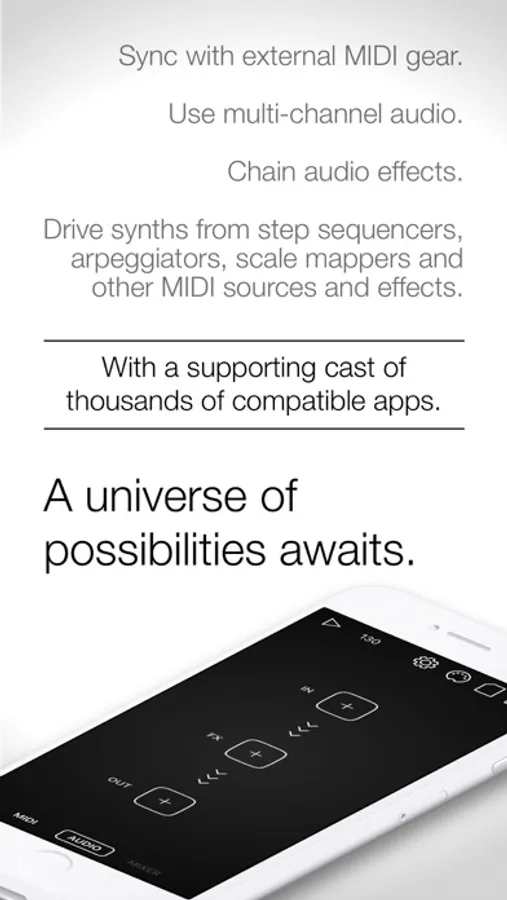 Send live audio or MIDI from one Audiobus-compatible app or AUv3 Audio Unit to another. Add effects on top of your favourite synthesizer, and use your favourite step sequencer to drive it. Or plug in your guitar, and create your own effects chain, in parallel with your mic input. Adjust the mix and balance with the mixer. And send the result to your favourite DAW, sampler or looper, or run it out through a multi-channel audio interface.