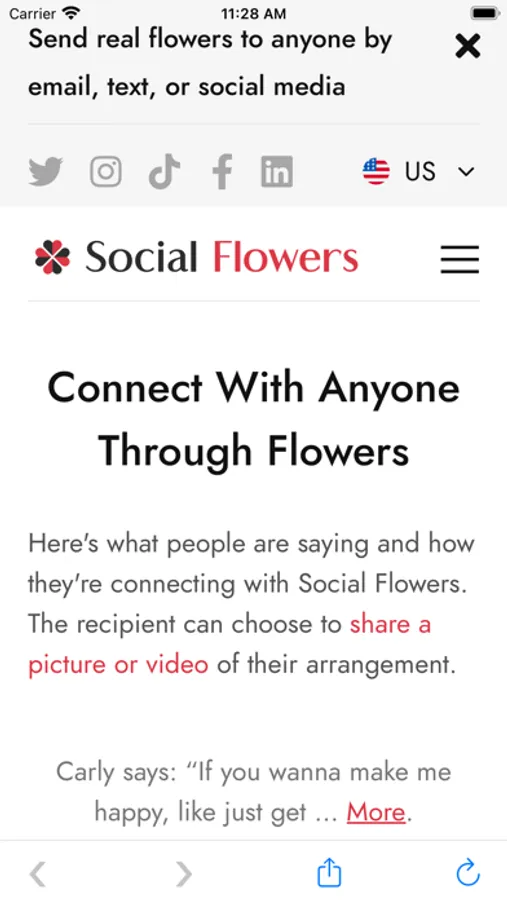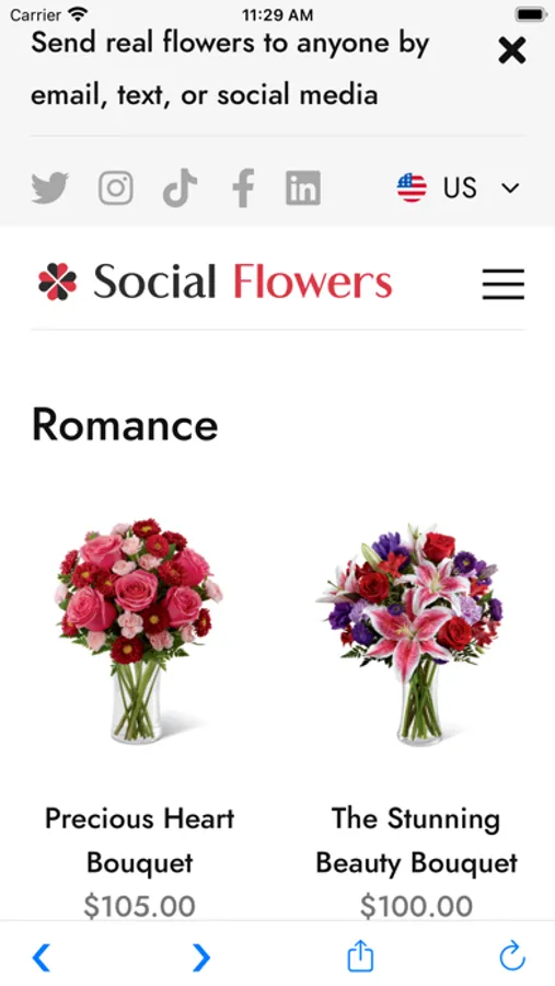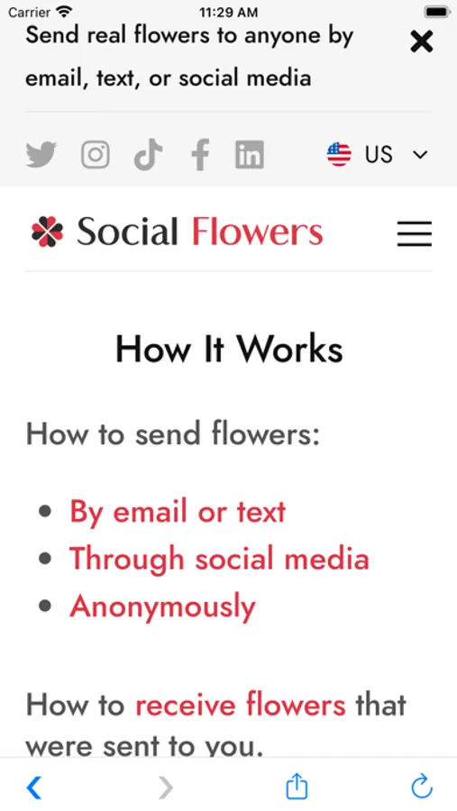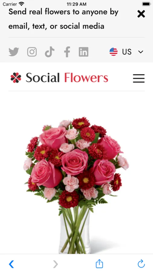 Social Flowers lets you send fresh flowers to anyone with just an email address, mobile phone number, or social media contact. The recipient receives a link and they provide the delivery address, we keep all information private.