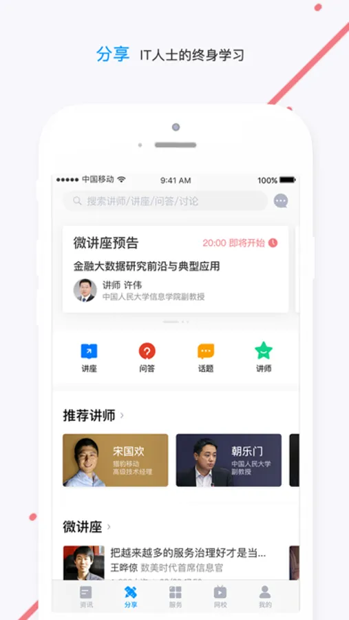分享频道包括微讲座、问答、话题和讲师四个栏目。截止2020年2月,已有200多位专家或CIO讲师在APP上进行了400多期各种新技术及应用话题的免费微讲座。专家和CIO可以在APP上分别按领域和按行业进行查找并联系。