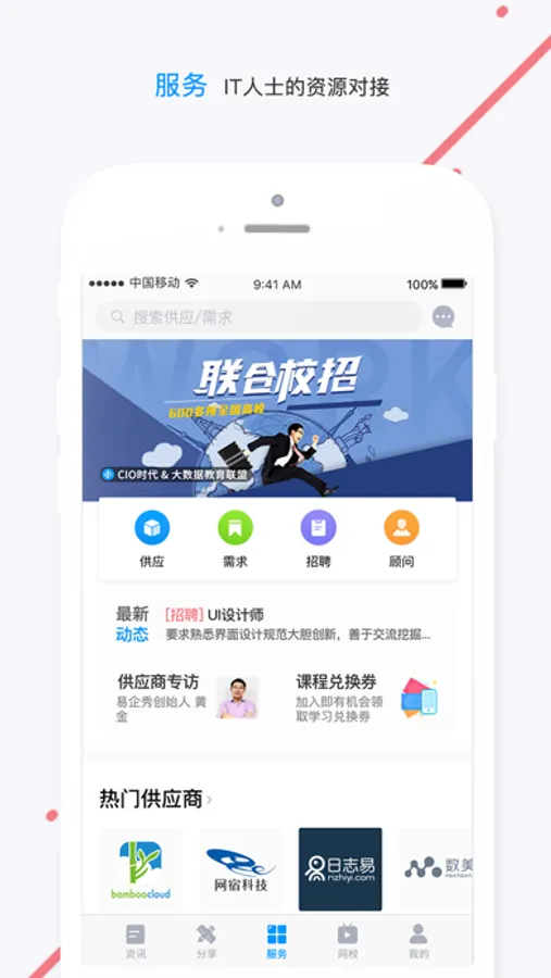 服务频道包括供应、需求、招聘和顾问四个栏目。供应栏目汇集了IT业界最新的新技术产品、服务和方案。需求栏目让用户可以随时发布需求信息。招聘栏目可用于企业IT人才的招聘。顾问栏目主要是专家顾问基于CIO时代APP的轻量级咨询与顾问服务。