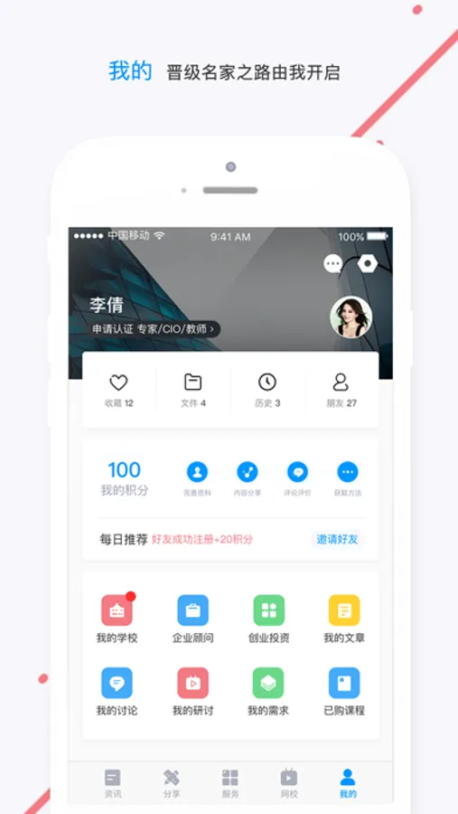 我的频道主要有我的学校、我的组织、我的服务、我的日历和附近打卡等功能。在我的频道,用户可以查找或使用各种与自己相关的内容或功能。其中附近打卡是一个用于会员之间社交的功能,会员可以随时登录APP查看自己周边的CIO班学员或APP会员,并可直接建立联系。