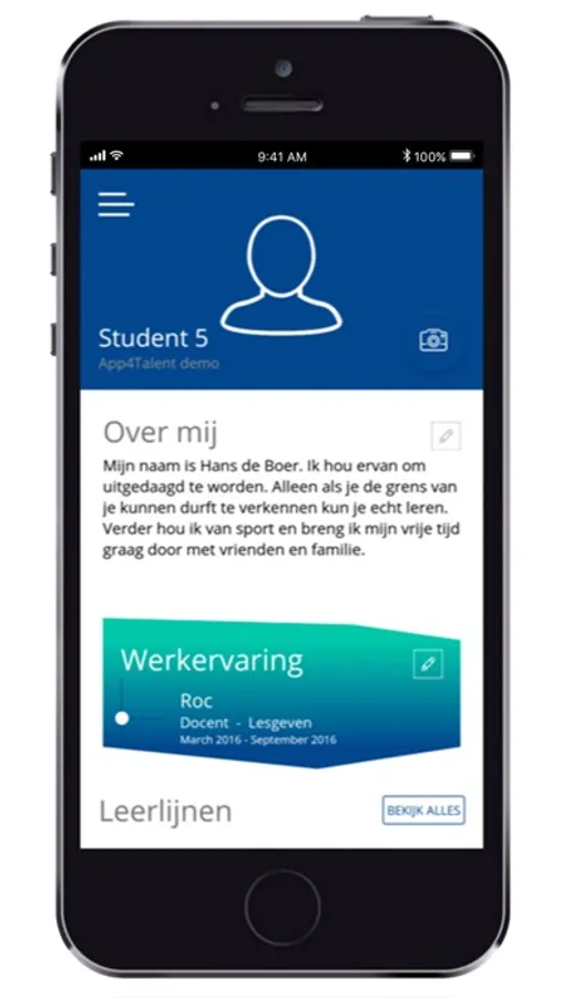 App4Talent geeft inzicht in talenten en kwaliteiten van studenten. Met deze applicatie kunnen studenten op eenvoudige manier praktijkopdrachten vastleggen in een digitaal portfolio. Middels foto- en videobeelden kunnen studenten hun praktijkervaringen zichtbaar maken aan hun docent. Docenten kunnen realtime de opdrachten van de studenten controleren en evalueren. Zo heeft de docent altijd zicht op de ontwikkeling van de studenten. De docent evalueert en beoordeeld opdrachten van student via zijn eigen inbox. Zo kan de docent de ontwikkeling van de studenten monitoren en bijhouden. Tevens kan de docent op afstand opdrachten voor de studenten klaarzetten. De studenten krijgen deze opdrachten toegestuurd naar hun app.