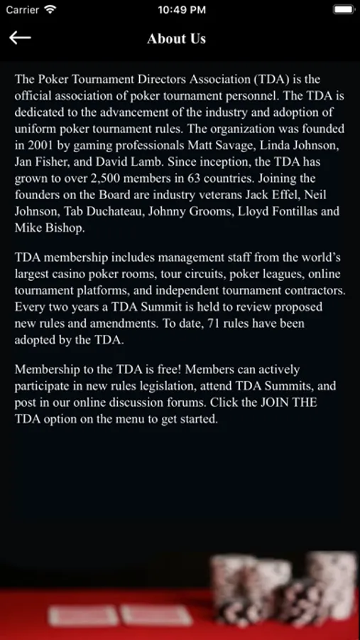 The TDA is the official association of poker tournament personnel. It was founded in 2001 by gaming professionals Matt Savage, Linda Johnson, Jan Fisher, and David Lamb. Since inception, the TDA has grown to over 1,300 members in 39 countries.