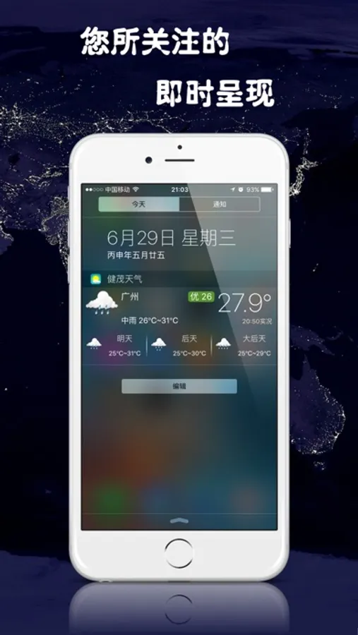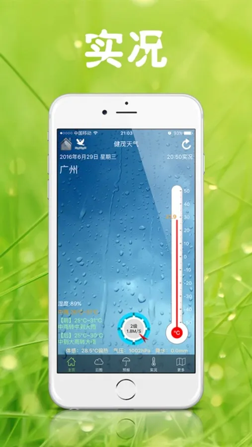 健茂天气是一款以图说天气为主的天气软件,支持两千五百多个县级以上城市天气实况、预报等信息,支持一周内气温趋势图、实况温度计动画显示以及风向风力盘图等,支持台风实时路径以及流场动画。健茂天气还包含了实时气象卫星图,晴天多云一目了然;降雨预测神器雷达图,让您出行无忧;气象预报图,掌握天气未来趋势;气象实况图,全面了解过去天气状况等等。结合图文,天气信息全面、及时、准确、实用!健茂天气,时刻掌握天下气象!