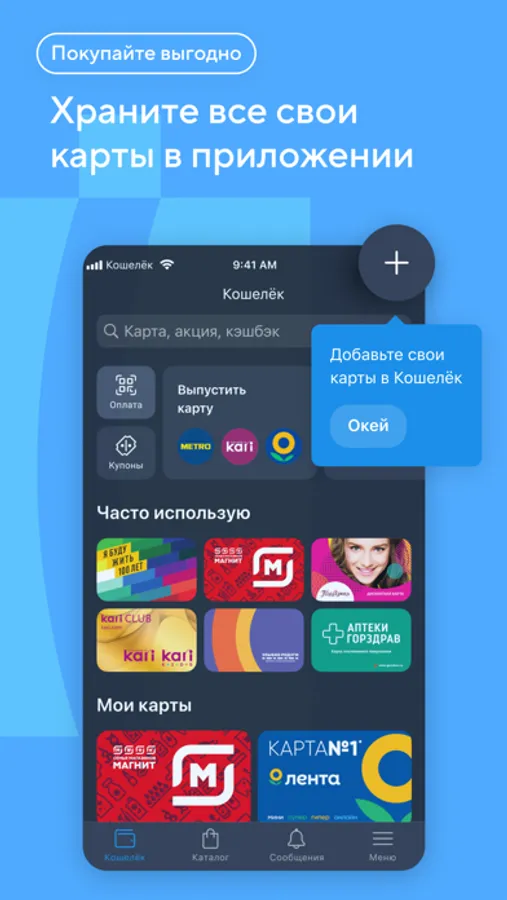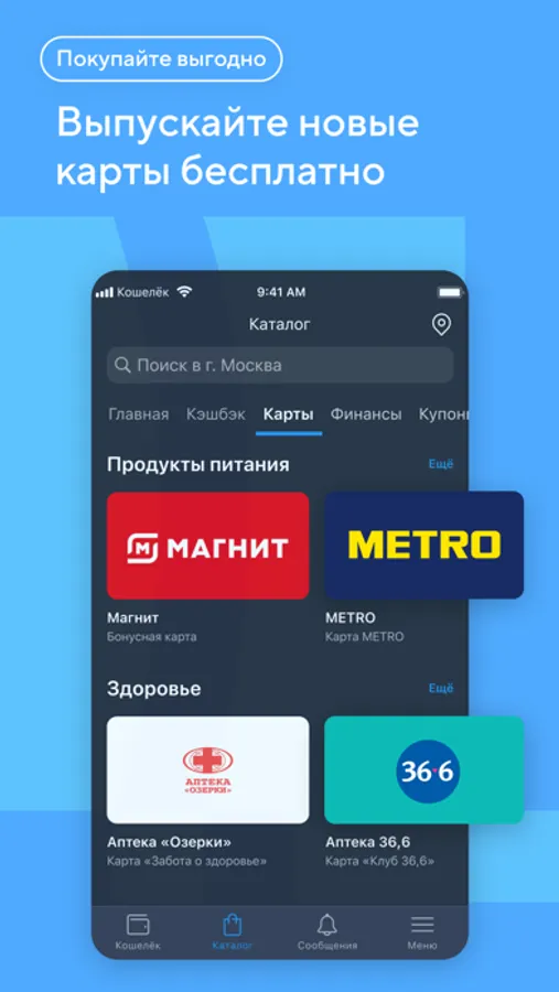 В Кошельке можно выпустить до 50 бонусных и скидочных карт наших партнёров: Магнит, Лента, Подружка, Kari, Улыбка Радуги и других. Просто выберите нужную вам карту и нажмите «Выпустить». Это бесплатно.