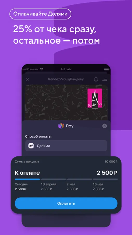 Подключите Долями в Кошельке и платите на кассе только 25% от суммы в чеке. Остальные 3 платежа по 25% будут списываться автоматически раз в 2 недели. Всё это без комиссий и переплат. И даже не нужно выпускать новые банковские карты.
