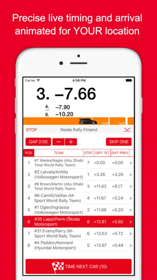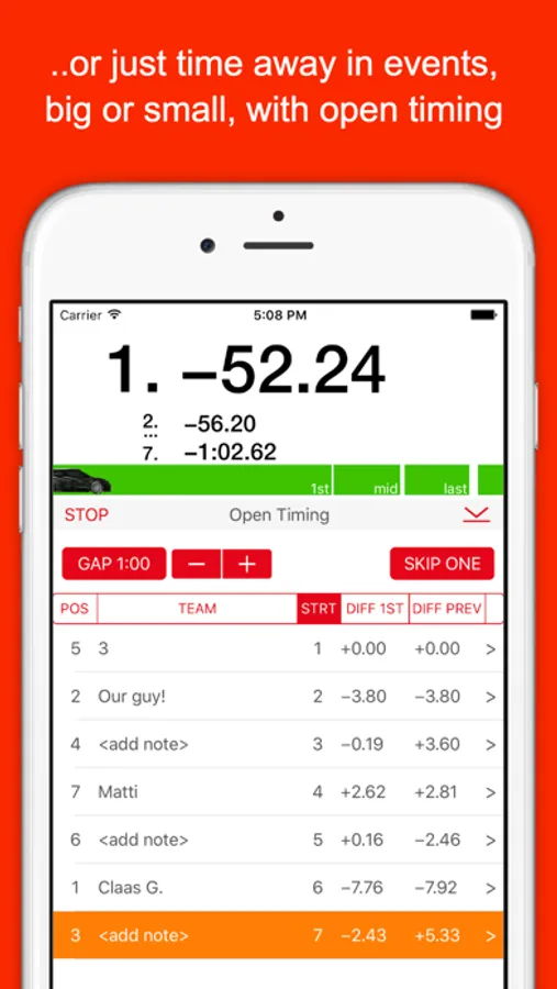 Less waiting. More thrill. Accurately assess the live-performance of passing vehicles or athletes as a spectator of sports events in time-trial mode: Motorsport rallies, cross-country skiing events, bike time trials, ….