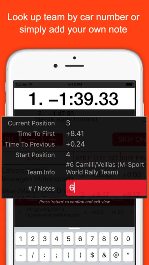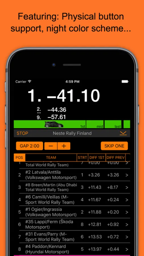 RallyTime lets you easily take and compare times at staged motorsport events like the World Rally Championships (WRC) and many other sports events, from wherever YOU spectate. Relieving you of a complicated calculation of relative times of a large number of participants with different, possibly changing start times, RallyTime keeps you in the loop and safe. No more egg timers or old-school stopwatches.