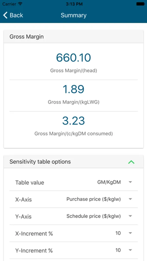 Each scenario lets you input a variety of factors that will influence gross margin. These range from costs, such as transport and health treatment costs, to factors such animal growth rate and death rate.