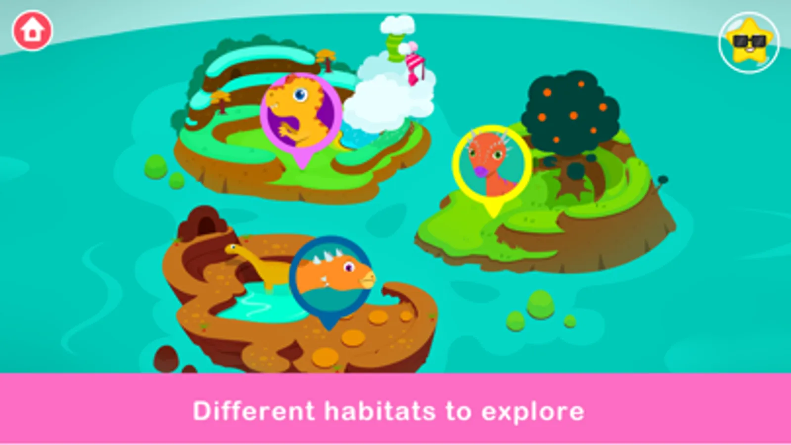 The daily life of the little Triceratops is filled with playful activities. Your child can guide the Triceratops to jump in mud pits, swim underwater in search of hidden treasures, hop onto trees from the ground, and swing through the forests using vines. There's always a new discovery waiting around the corner, and each reveals an interactive puzzle that helps children learn about shapes, colors, and the prehistoric world.