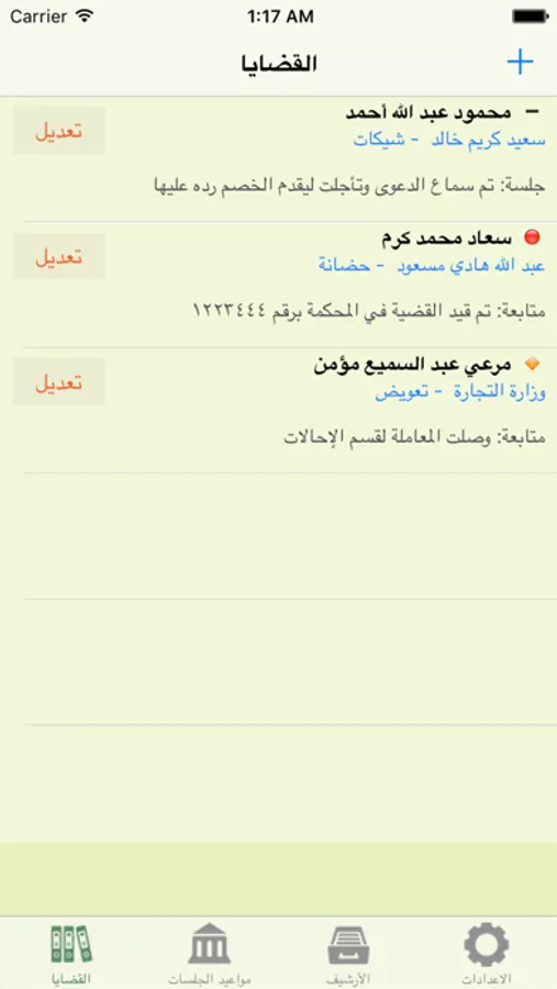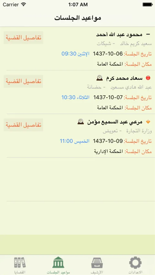 ٤- وضع علامات بجانب كل قضية توضح اقتراب موعد الجلسة فتوضع علامة حمراء إذا كان موعد الجلسة في اليوم التالي وعلامة صفراء إذا كان موعد الجلسة في الإسبوع الحالي