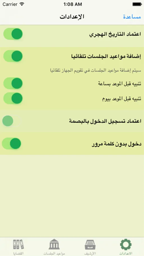 ٣- مزامنة مواعيد الجلسات مع تقويم الجهاز وإعداد تنبيهات تلقائية ليقوم الجوال بتذكيرك قبل تاريخ الجلسة بيوم وقبل موعدها بساعة.