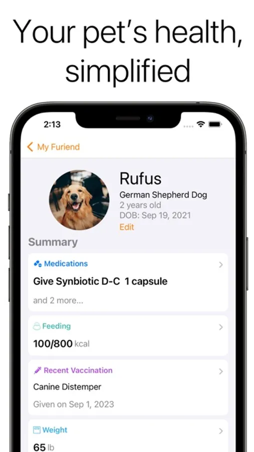 Create individual profiles for each of your pets, complete with their name, breed, age, weight, and any important medical information. This makes it easy to manage multiple pets seamlessly. Furiend is free for one pet. You can manage more than one pet if you subscribe to Furiend+.