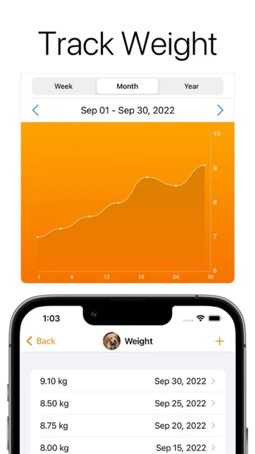Monitor your pet's weight over time and view their progress in a beautiful chart.