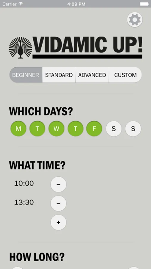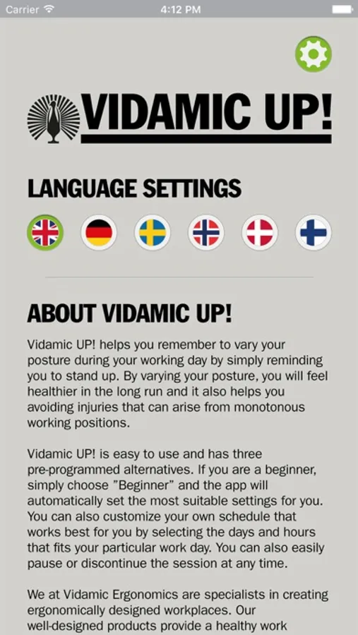 Vidamic UP! is easy to use and has three pre-programmed alternatives. If you are a beginner, simply choose ”Beginner” and the app will automatically set the most suitable settings for you. You can also customize your own schedule that works best for you by selecting the days and hours that ts your particular work day. You can also easily pause or discontinue the session at any time.