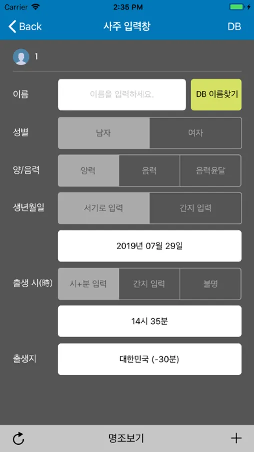 2) 출생지역 선택 기능(출생시각 자동보정)