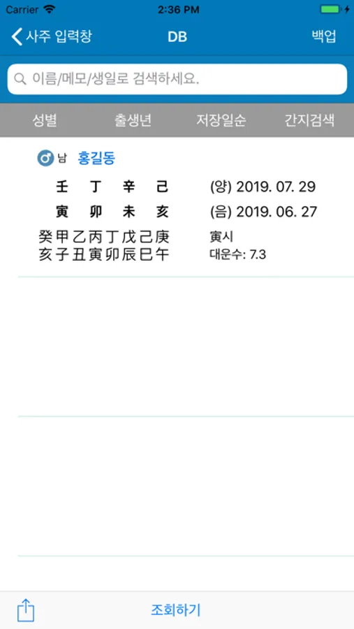 8) 저장된 명조 검색 기능 (이름, 메모, 년도/월/일/시, 성별 등으로)