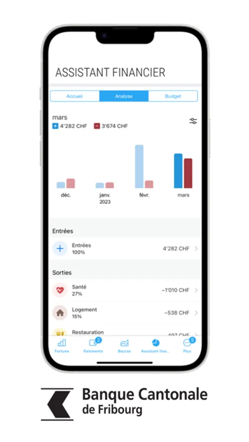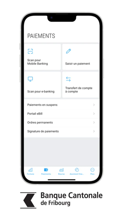 - Paiements - Saisissez vos paiements simplement et rapidement grâce au lecteur de bulletin de versement et QR-facture, effectuez des transferts de compte à compte, gérez vos e-factures.