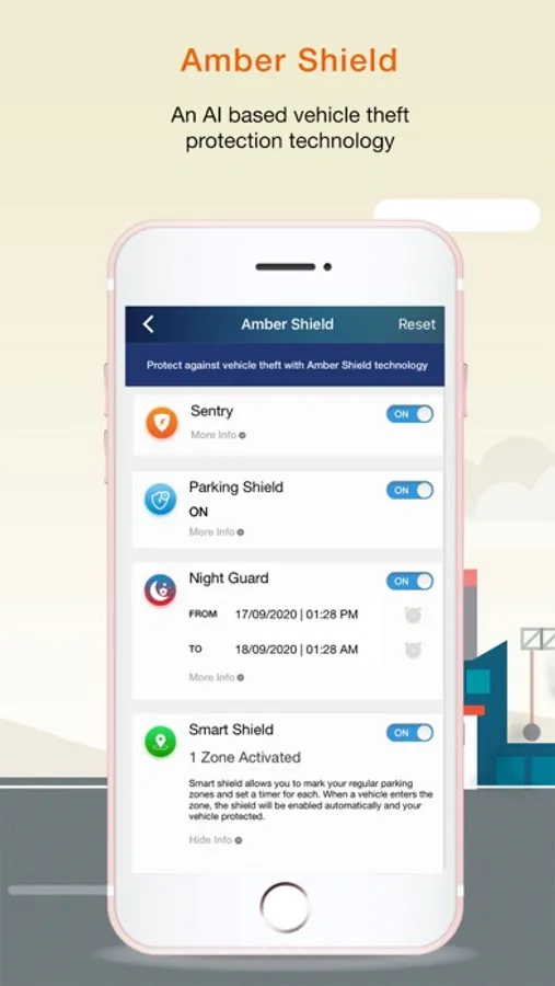 Parking Shield : When enabled, will sound a distinctive alert on your app and perform engine shut down if any activity is registered.