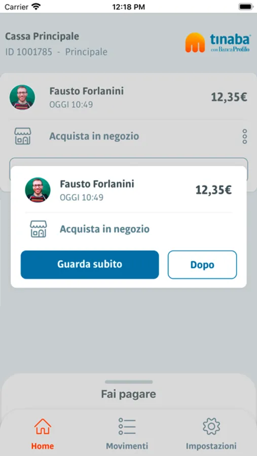 Ricorda: se sei una Partita IVA o Ditta Individuale dovrai prima effettuare l’upgrade gratuito a Tinaba LEVEL A attraverso la pagina dedicata agli esercenti sul nostro sito www.tinaba.com.