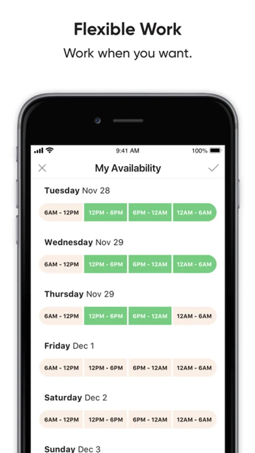 Simply set your availability and Flex will invite you to gigs aligned with your preferences, skills, and location.