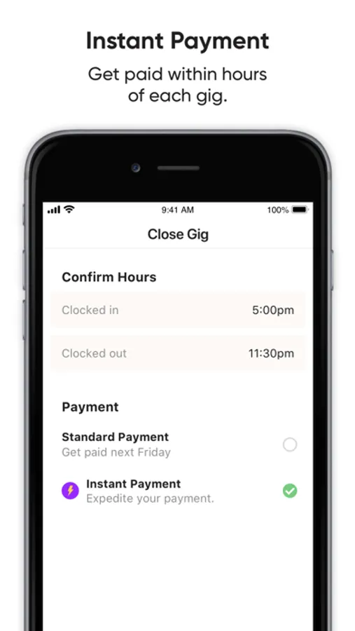 *Instant Pay is conditional on the achievement of performance criteria, a current/active and supported debit card, a supported tax profile, and approval of hours worked. Certain gigs may require additional time to verify worker hours and in such cases, payment may take longer to process.