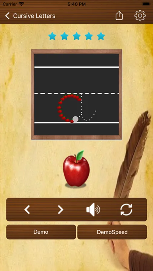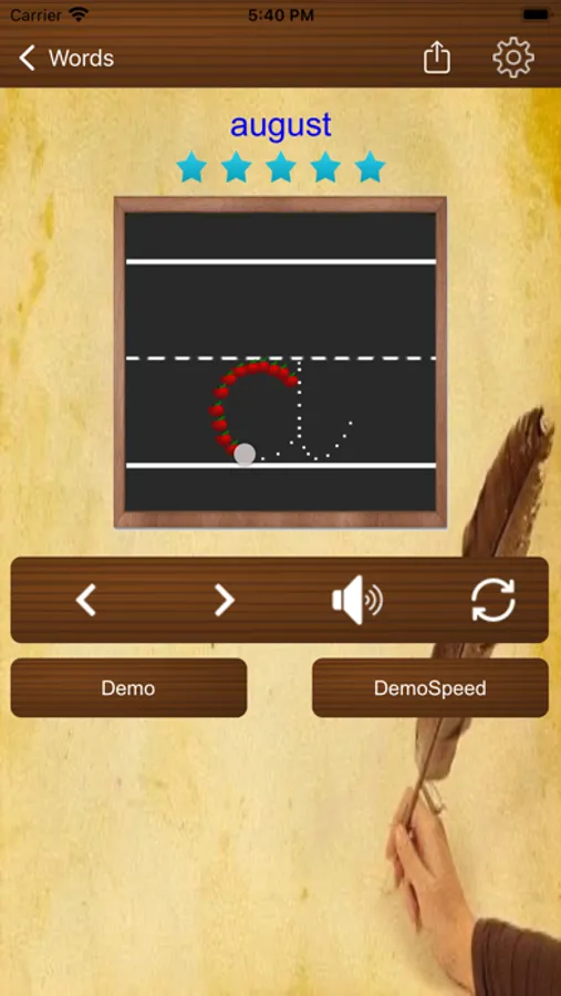 The demo feature displays how each letter can be practiced with adjustable demo speed.