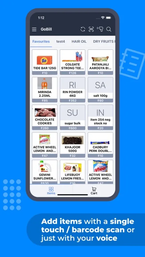 - Add item to cart by either searching with item name/code or by scanning with barcode