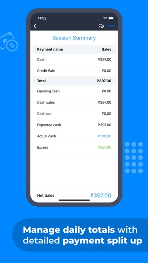 - Session management with cash withdrawal option to monitor the cash flow in the counter. Also, a session report is generated on closing the session at day/shift end for handover with values of Cash Excess or Shortage, if any