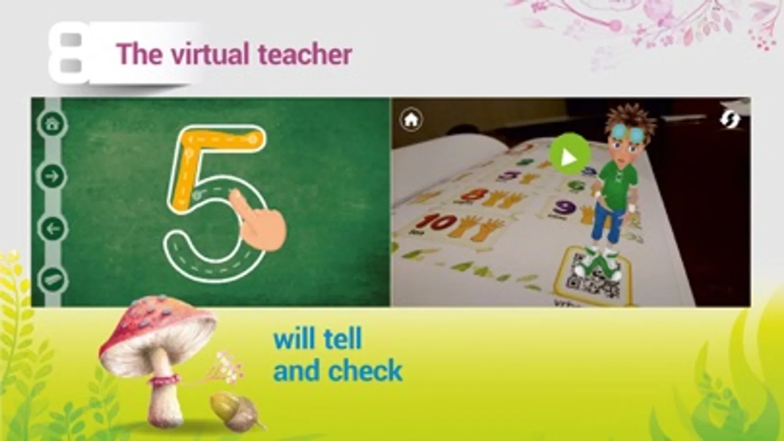 A children's figures textbook with an augmented reality. With the help of this program you will be able to teach the child to count both in your native language and in English. An interactive “Children’s interesting book with a virtual teacher” will help to make the process of learning to be like a game. Just print the pages of a book with the assignments and together with your child you will immerse in the gameplay in the real and virtual worlds at the same time. In the real world, the child performs logical tasks, does account training, writes numbers in the copybook, learns how to draw lines and figures, the names of parts of the body and animals, and colors the animals. Then he points the tablet or a smartphone at the page of the manual textbook with the exercise completed - and a virtual teacher, a cartoon character Danik appears on the screen of the device. He can talk, explain the tasks, teach your child to correctly pronounce English words and animate painted animals, tell a lot about them, and, what is most important, he can check if the exercises are correct.