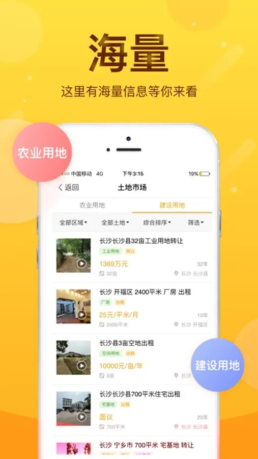 2.土地市场提供:宅基地、房地产、房产等农村房屋用地;工厂、厂房、仓库、仓储、物流、住宅、住房、建筑、建设等二手工业商业用地;种植、花卉、苗木、水果、蔬菜、养殖、饲养、畜牧、渔业水库等项目用地;招标、拍卖、挂牌等招拍挂土地资源。