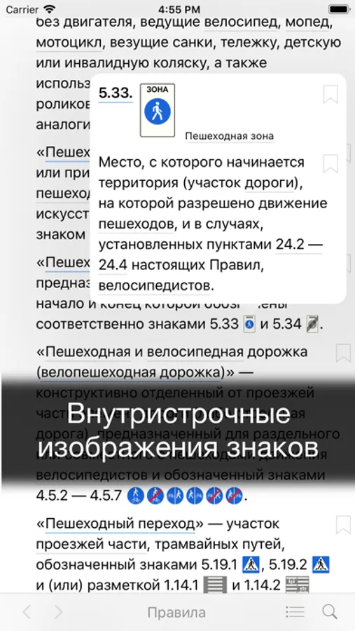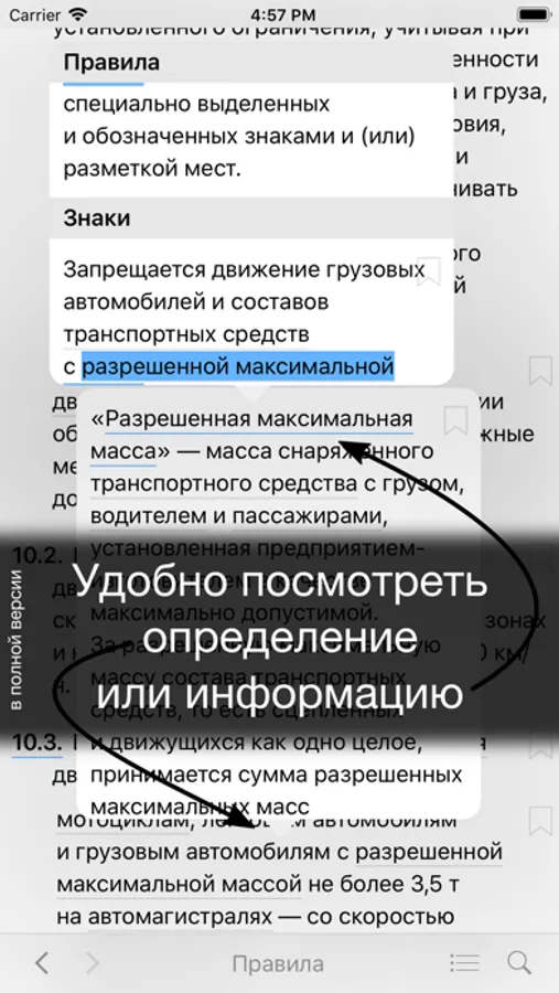 Поясняющие ссылки. Во-первых, ссылки на определение: встретили в тексте «разрешенная максимальная масса» или «пункт 7.2» и тут же уточнили что это в небольшом всплывающем окне без перехода в другой раздел и потери хода мыслей. Во-вторых, ссылки на упоминание: как быстро узнать, где в Правилах встречается «велосипедная дорожка»? а знак 2.5? Очень просто — нажали и посмотрели.