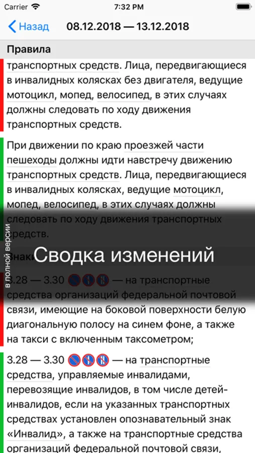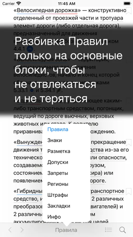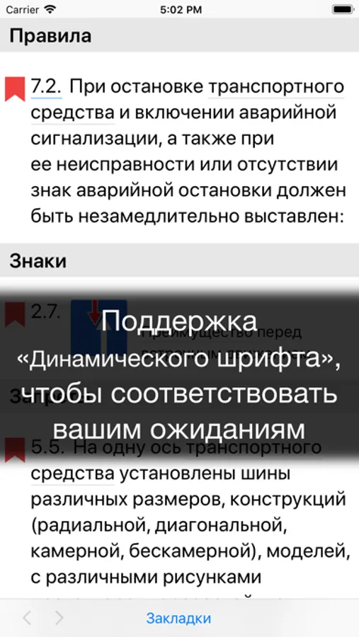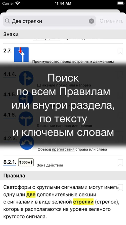 В программе можно сохранять закладки на любой абзац правил. Если у вас несколько устройств, то закладки будут синхронизированы между ними. Ищите необходимую информацию сразу по всем Правилам или сузьте поиск до определённого раздела.