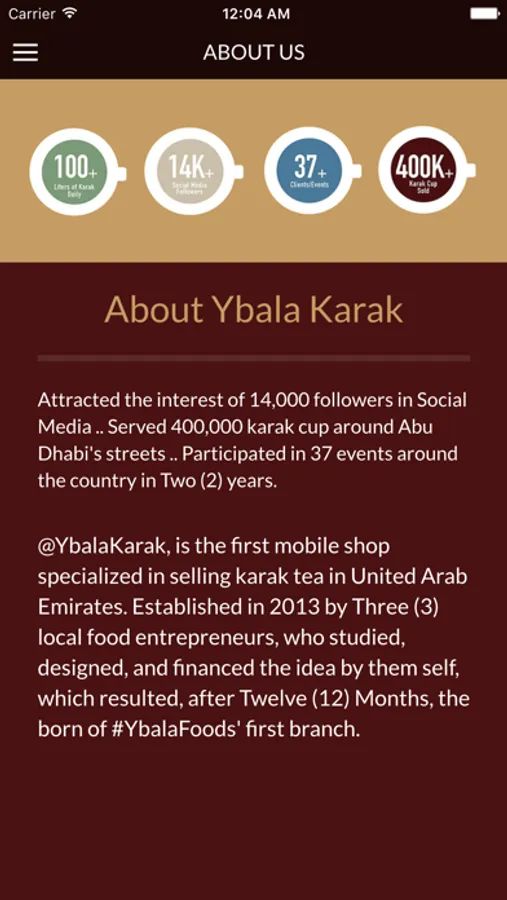 Attracted the interest of more than 14,000 followers in social media channels.. Served 400,000 karak cups around Abu Dhabi's streets.. Participated in 37 events all over the country in 2 years.