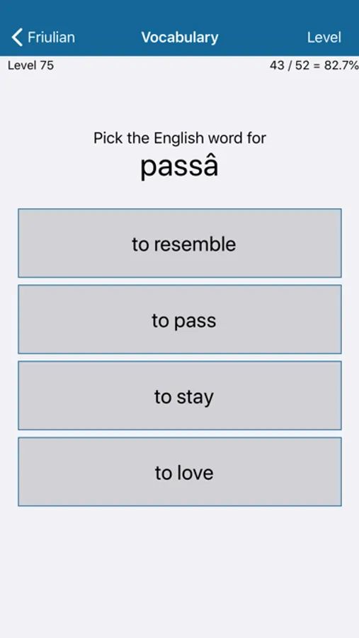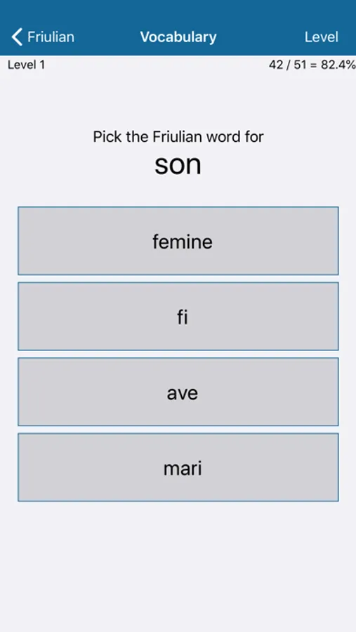 • Vocabulary: 125 levels, each testing your ability to match ten Friulian words with their English equivalents. Interspersed among these are cumulative levels reviewing what has been learned earlier (giving a total of 142 levels).