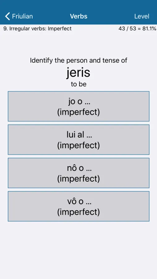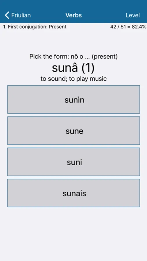 Wherever you have your phone and a free moment, it offers a continuous multiple-choice test on Friulian vocabulary and the conjugation of Friulian verbs. Each answer you give is immediately confirmed or corrected, and your knowledge is reinforced by repetition.