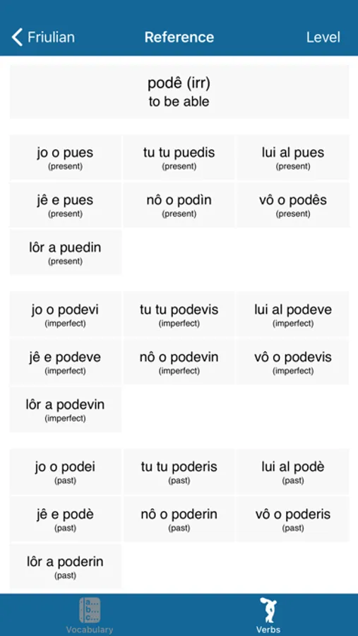 • Verbs: Tests your ability to parse and to conjugate a range of representative regular and irregular Friulian verbs.