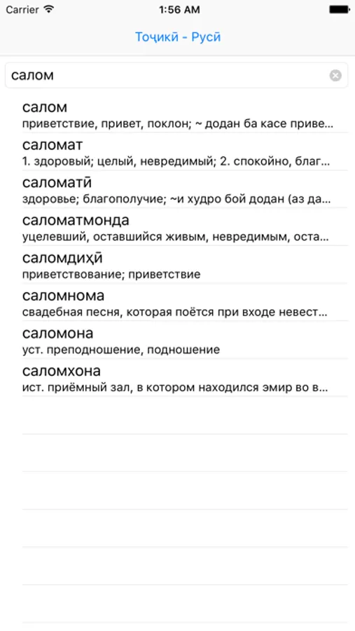 * Автоматический поиск слов с буквами (ғ, ӣ, қ, ӯ, ҳ, ҷ) не имеющиеся на клавиатуре;