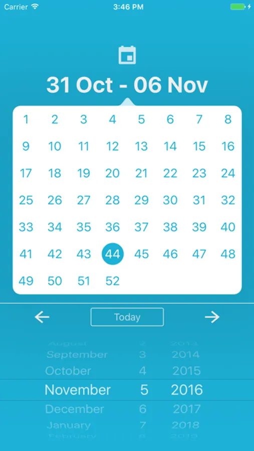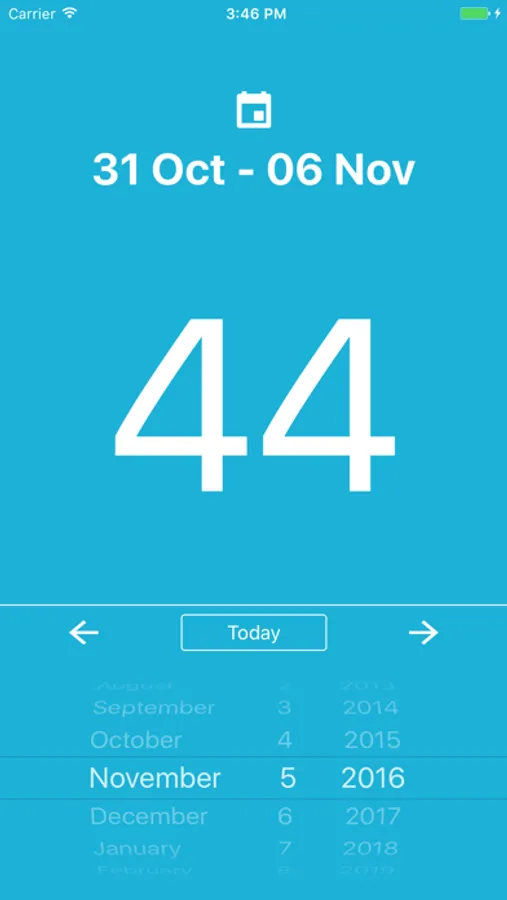 App allows you to see current week number, as well as easily navigate to different weeks of this year or even see what week number was for specific date.