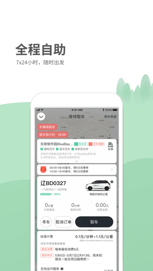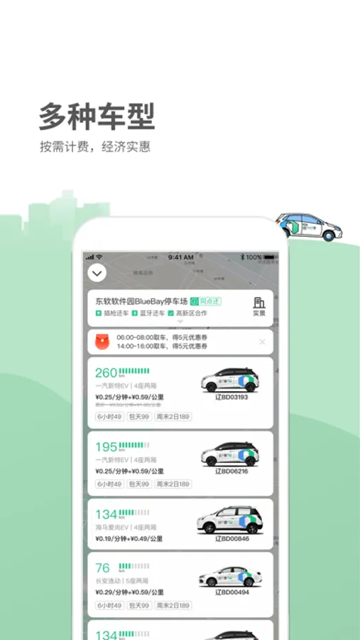- 分时租赁车型均为纯电动汽车,新能源,零排放。