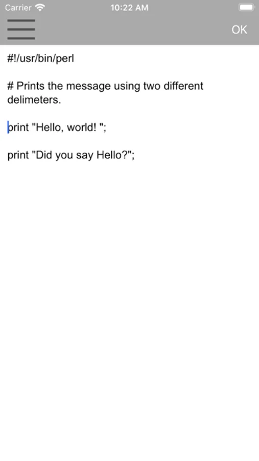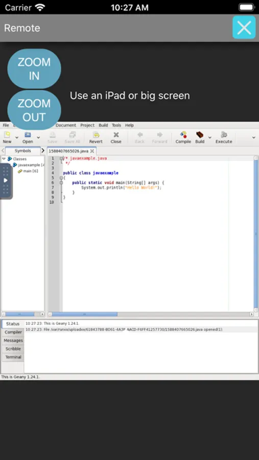 This app is an access to a Geany app that is run remotely. Note that in order to use this app you must use the following actions with your fingers: