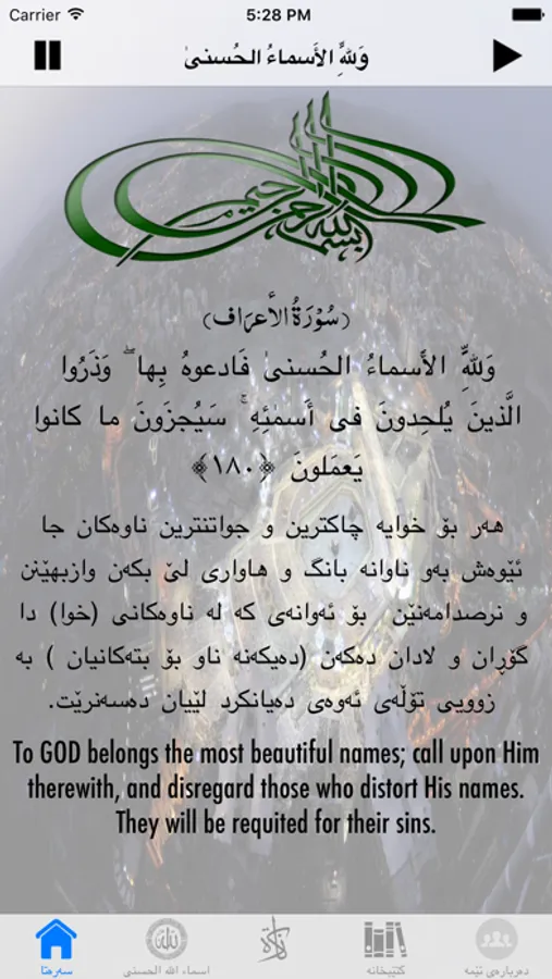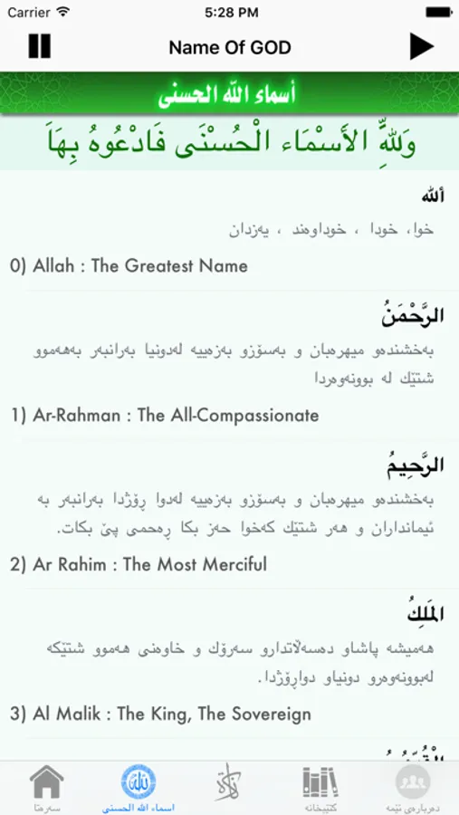 ئەم بەرنامەیە پێکهاتووە لە ناوە پیرۆزەکانی خوای گەورە بە هەر سێ مانای کوردی ،عەرەبی وە ئینگلیزی وە سرودێک بۆ ناوە خوانەکانی خوای گەورە