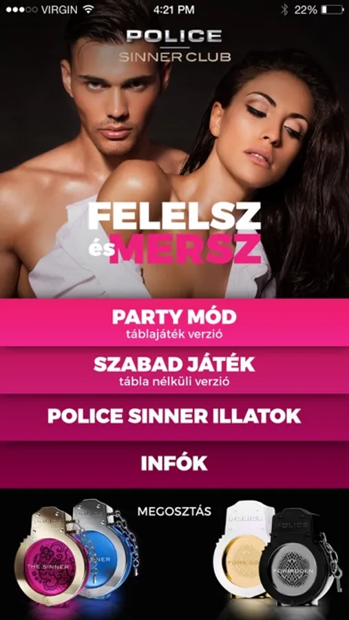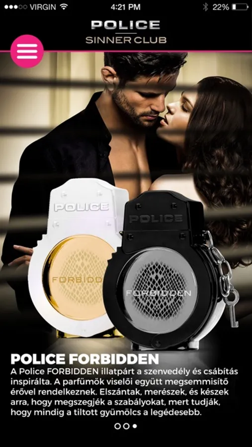 A mobilalkalmazás támogatója a POLICE The Sinner parfümök, melyeket a bűnös csábítás és szenvedély inspirált. Próbáld ki te is!