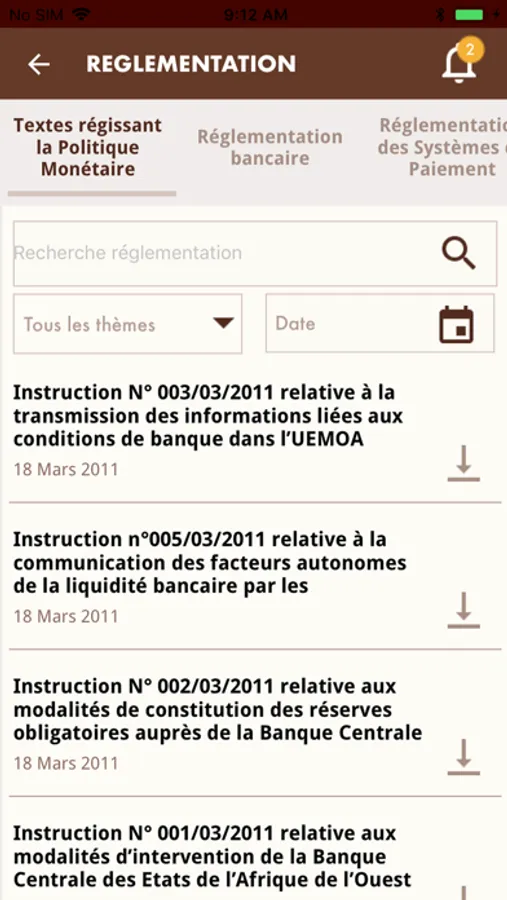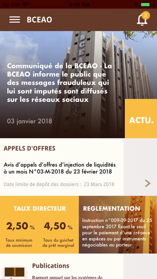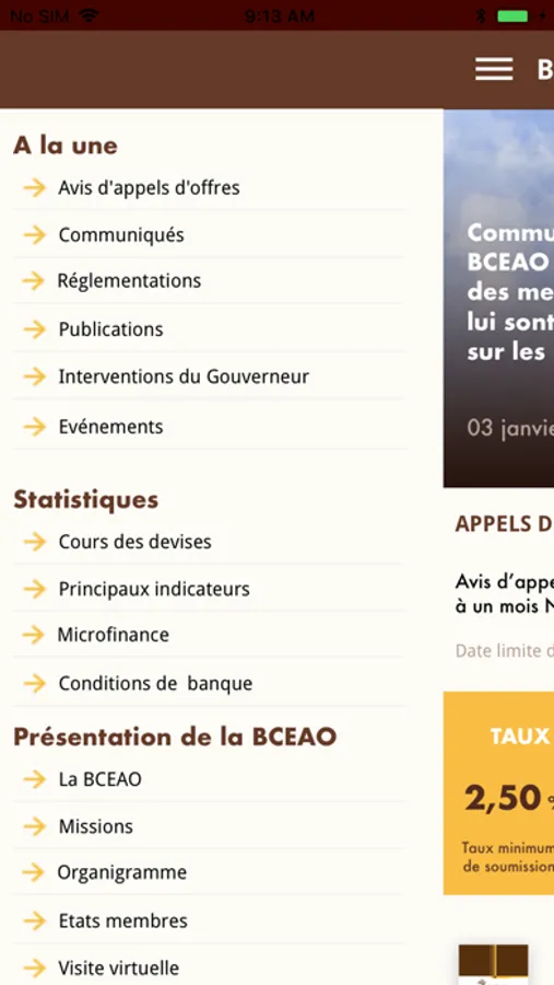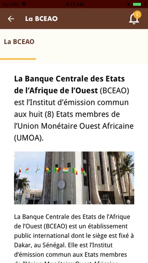 Application mobile de la Banque Centrale des Etats de l'Afrique de l'Ouest (BCEAO). L' application mobile permet la consultation des principales rubriques du site, en mode « connexion » et « hors connexion ».
