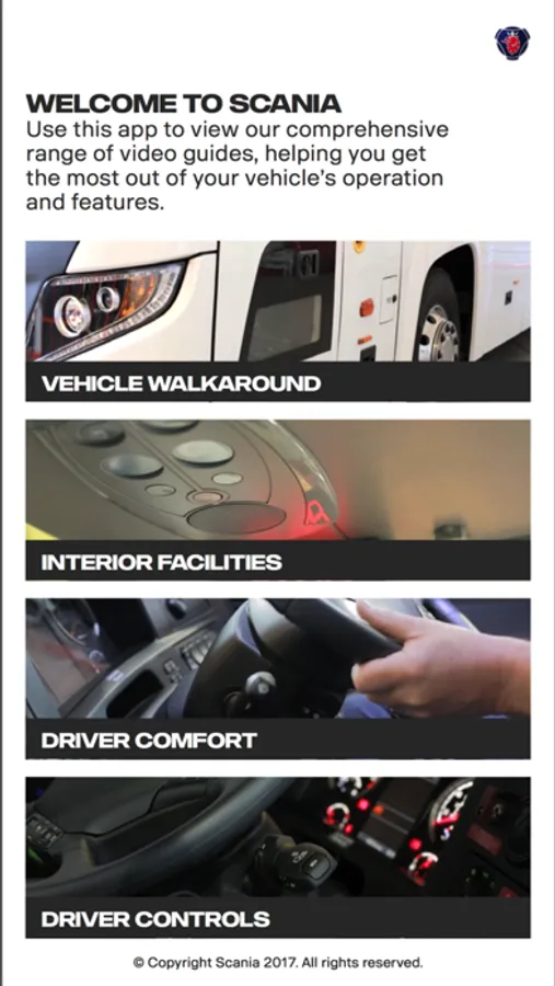 Welcome to Scania. Use this app to view our comprehensive range of video guides, helping you to get to grips with your vehicle's operation and features.